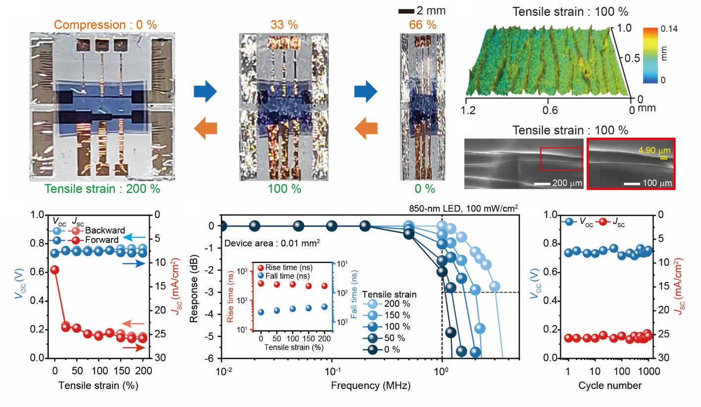 연구팀은 개발한 초박막·초유연 근적외선 유기 광검출기의 기계적 내구성과 전기적 안정성을 검증하기 위해, 소자를 늘리고(인장) 누르는(압축) 극한 변형 조건에서 시험했다. 그 결과 소자는 최대 200% 인장 변형과 수십 퍼센트 압축 변형에서도 구조적 손상 없이 형태를 유지했다. 이처럼 큰 기계적 변형에도 불구하고, 광전압과 광전류 등 전기적 특성은 대부분 유지됐으며, MHz급 고속 광응답 특성 역시 변형 전후 큰 차이를 보이지 않았다. 또한 1000회 이상의 반복 인장 시험 후에도 성능 저하가 거의 없어, 실제 피부 움직임이나 착용 환경에서도 안정적인 동작이 가능함을 확인했다.