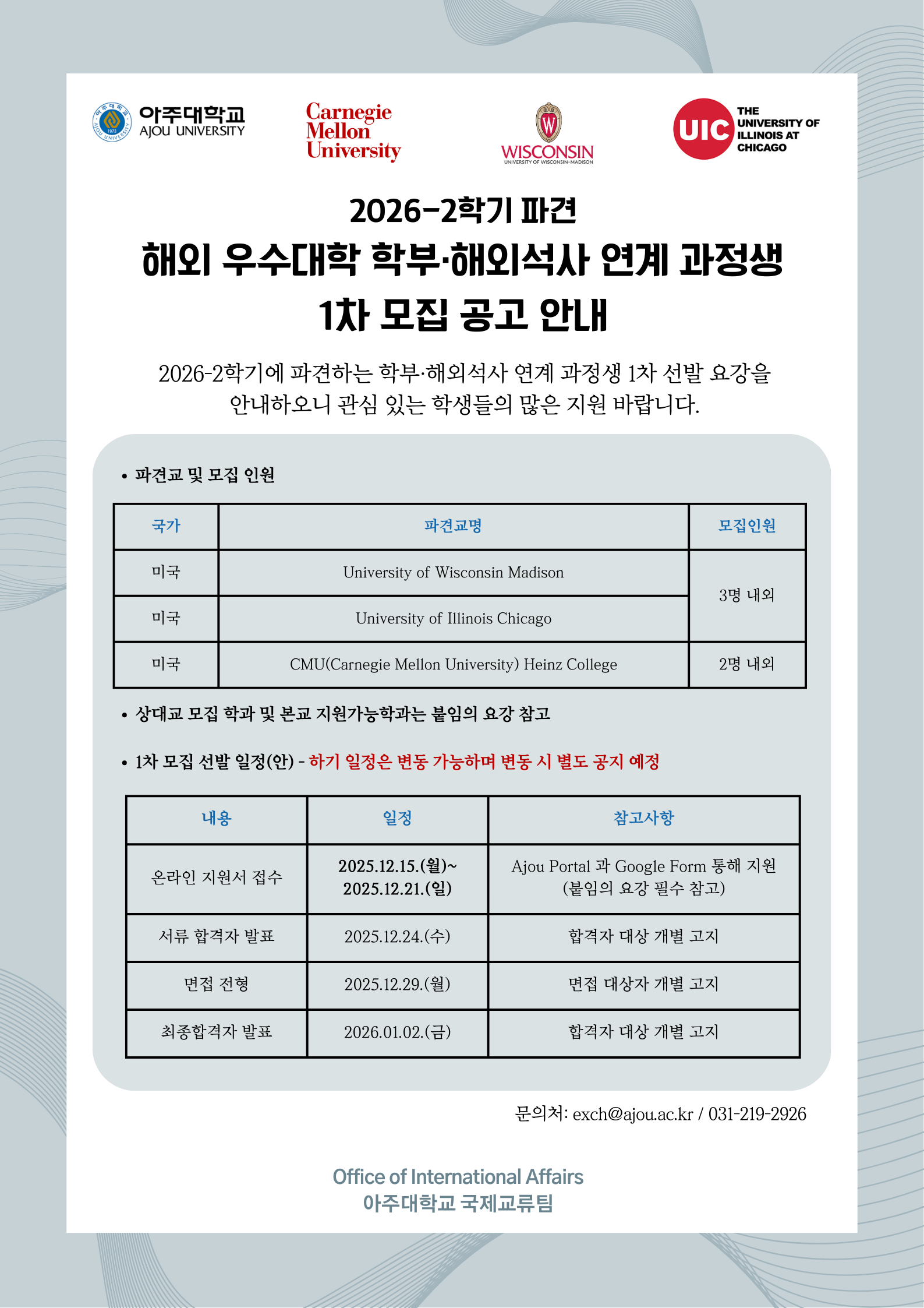 [Outgoing] 2026-2학기 파견 학부·석사 연계과정 프로그램 모집 공고