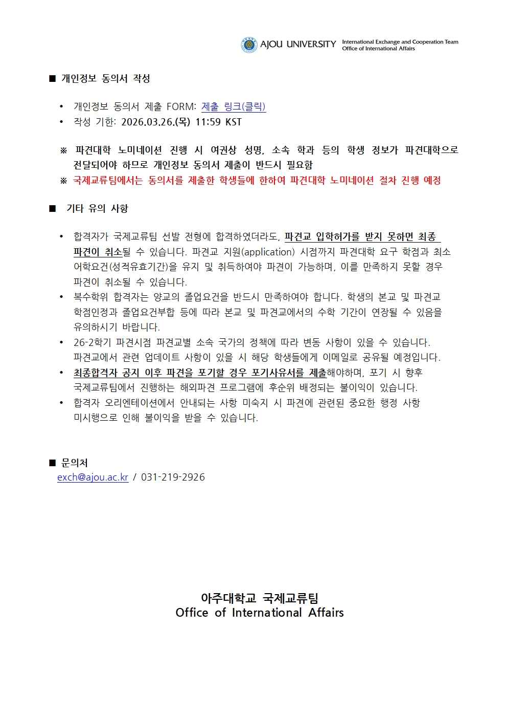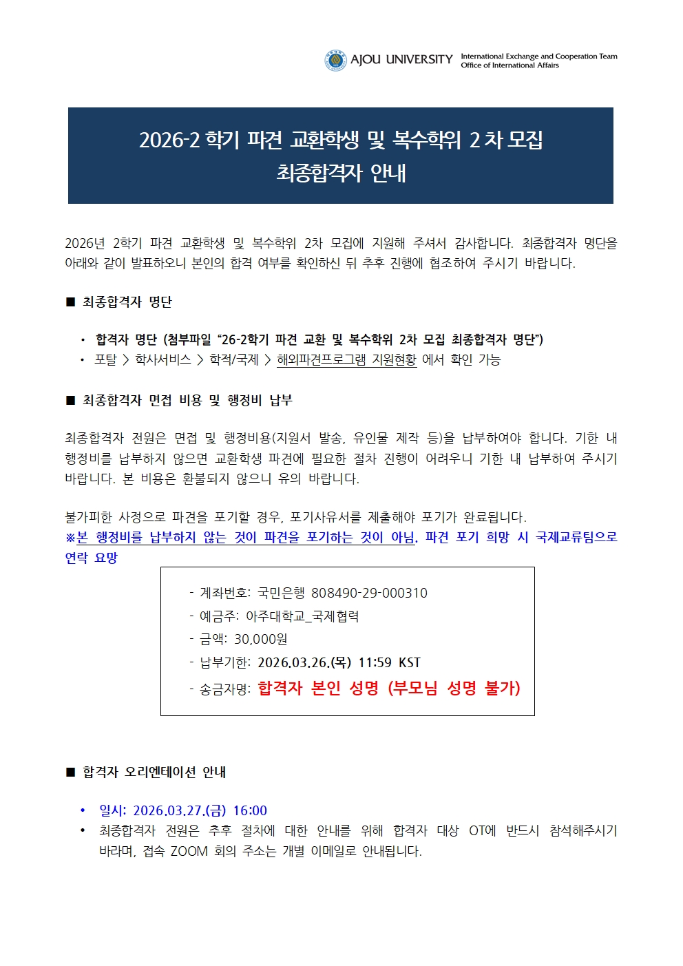 [공지] 2026-2학기 파견 교환 및 복수학위 2차 모집 최종합격자 공고